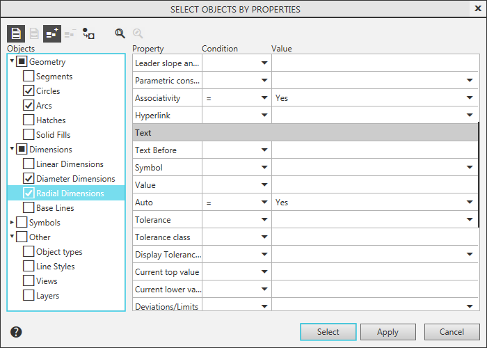 To perform selection of objects according to specified conditions and close the dialog, click the Select button. If you need to keep the dialog on the screen after selecting objects, click Apply.