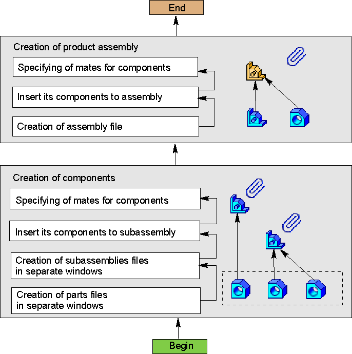 This method involves step-by-step creation of assembly components and its subassemblies starting from the bottom level and to the top level. Assembly components at all levels are created and edited in separate windows. Models are developed independently, based on pre-defined requirements for the composition of the assembly and its design. After insertion, components in the assembly and its subassemblies are positioned using matings.
