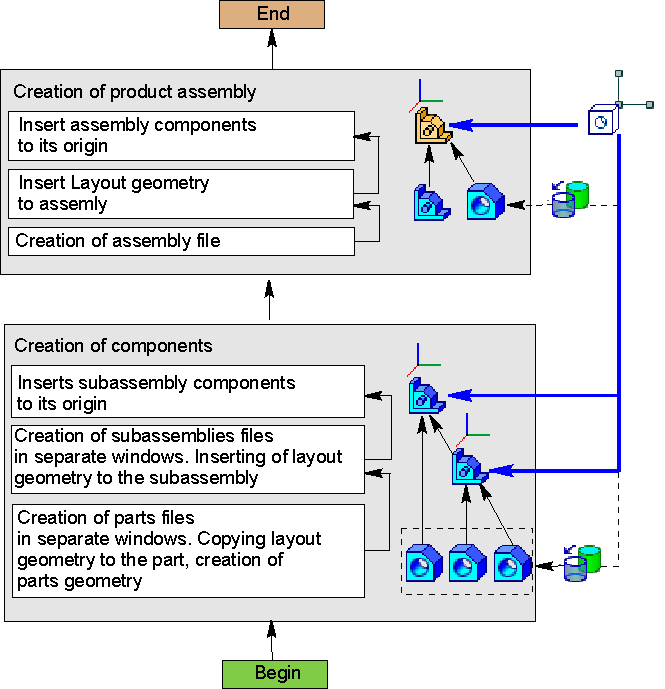 This method involves step-by-step creation of assembly components and its subassemblies in separate windows starting from the bottom level and to the top level. The required parts of pre-arranged detailing geometry are copied in the components. The coordinates of assemblies, subassemblies, and parts match.