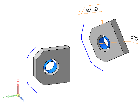The operation result is a new object – a solid or a surface. Objects derived from the initial ("old") solid or surface remain associated with this solid or surface. A new solid or surface may be involved in subsequent operations (including position change operations) without any constraints.