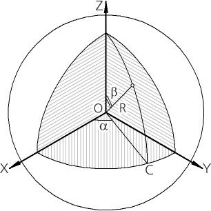The value of the B coordinate defines the zenith angle β which is counted from the Z axis in the plane that passes through the Z axis and OC ray.