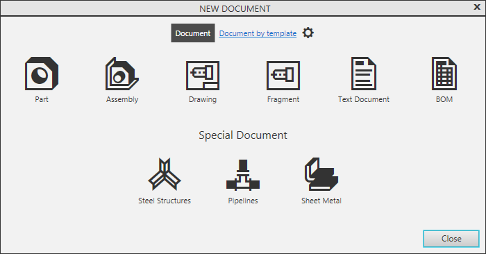 If you need a document with specific parameters (like sheet format, material, information about author, etc.), you can create a document from the selected template. To do this, when creating the document in the Start page or in the New Document dialog, click the Document by template link, and then double–click the desired template name. More details about templates...