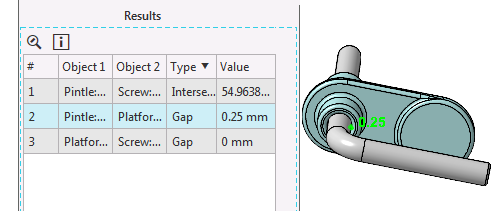 During the checking of gaps, the minimum distance between the specified objects of the assembly is found. This distance is compared with the set gap value.