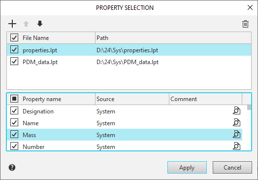 •The top dialog box displays a list of property libraries, presented in table format. Each row in the table contains the library file name and path. At the beginning of each row is an option for connecting a library. When enabled, the properties contained in the library are displayed in the lower dialog box and become available for connection. The option in the row with the column headers connects all libraries in the list at once.