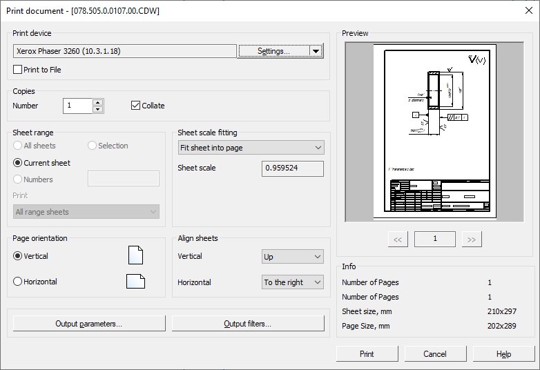 When working with a multi-sheet graphic document, you can print open just the current sheet. To do that, use the Set printing parameters and print sheet command in the context menu in the graphic area of the drawing. After you run this command, the print parameters settings dialog box will appear. The controls for setting up multi-sheet documents will not be available in the dialog box.