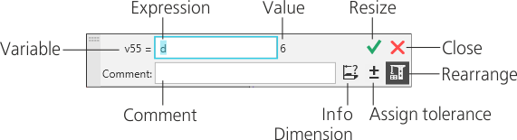 and completing the work in the dialog, the content of the Expression field is replaced by the calculated dimension value. This value is displayed in the field the next time you open the dialog.