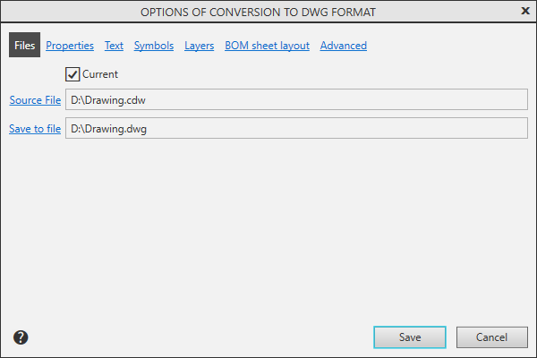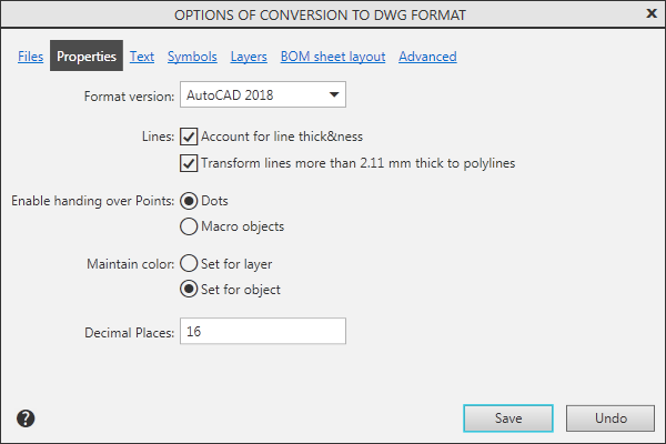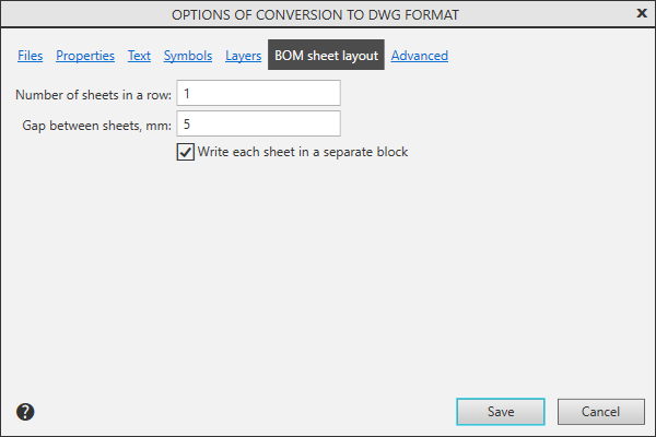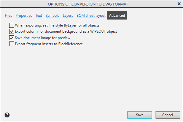 Dialog Output parameters in DXF and DWG formats |