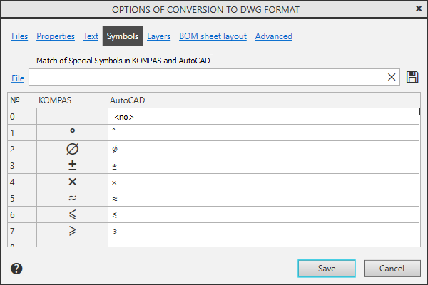Click this button to save the settings in the KOMPAS-3D and AutoCAD special character mapping file (*.acs). |