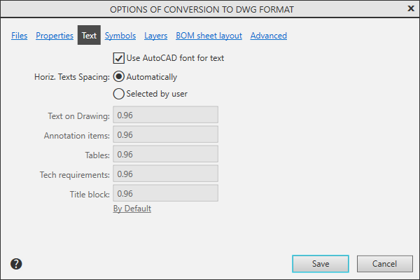 A group of elements that manages the dimensions of text objects. Enabling the Automatically option allows you to adjust the dimensions of the resulting text objects resulting from the export to the dimensions of the original ones. To set the required horizontal factors for exported text objects, enable the Selected by user option and enter the desired horizontal values for different types of labels. To return the default narrowing coefficients, click the link By Default. More details on setting up horizontal text spacing... |