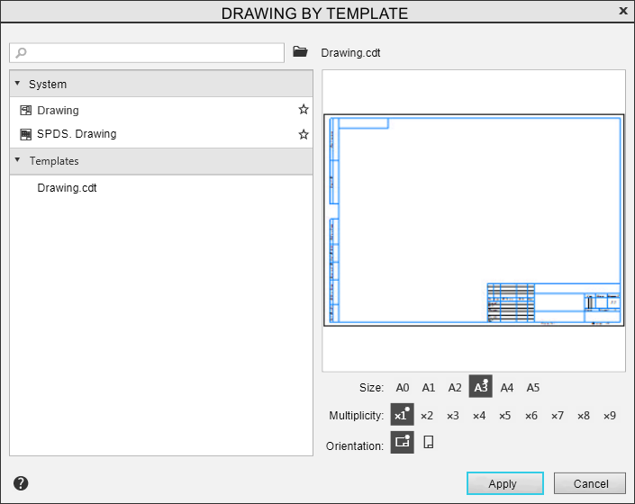 When creating a drawing from a single sheet document template, you can set the format, multiplicity and orientation of the sheet. This is done using the Format, Multiplicity and Orientation button groups located at the bottom of the right side of the dialog box. The button groups are displayed if the single sheet drawing template is highlighted in the list.