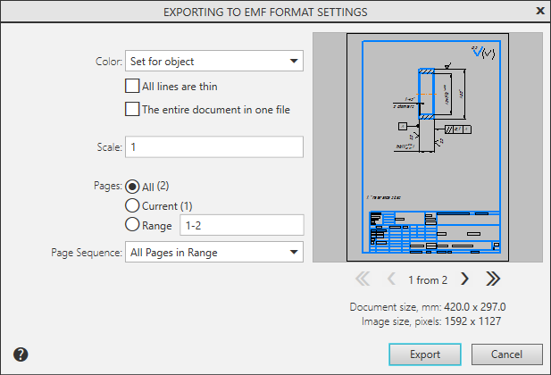 Dialog for setting up parameters of writing to EMF file (multi-sheet drawing) |