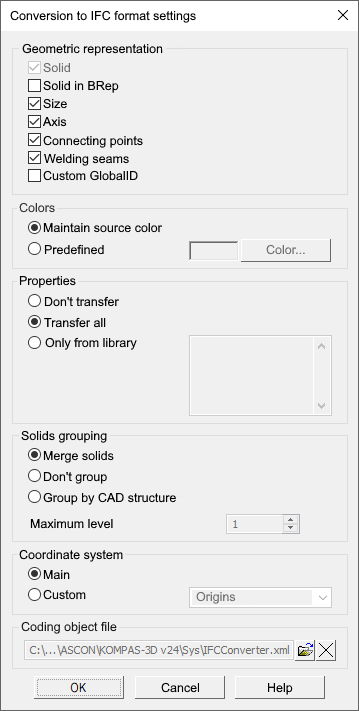 This group of options manages recalculation of coordinates of the object geometry in the IFC file. Please enable this option: •Main — coordinates of IFC objects will be presented in the main coordinate system of the original KOMPAS document. •User Defined — the coordinates of the IFC objects will be represented in the selected UCS of the original KOMPAS document. |