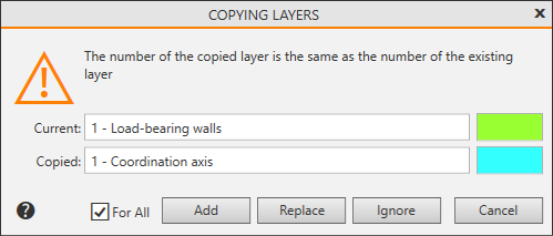 This dialog appears on the screen when copying layers between views, if in the view where the layers are copied, there are already layers with the same numbers as those of the copied ones.