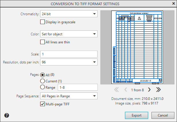 When saving to all the formats, except the TIFF format, a separate raster file is created for each sheet. The method of saving to the TIFF format is determined by the status of the Multi-page TIFF option.
