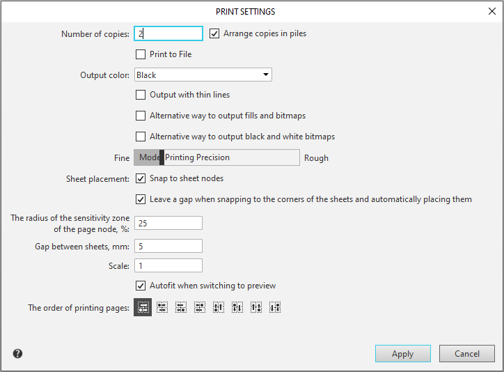 In addition, an abbreviated dialog appears after clicking Print settings... button in the print dialog of documents. In this case, the setting of the following parameters is available: output color, output with thin lines, an alternative method for outputting fills and bitmaps, model printing precision.