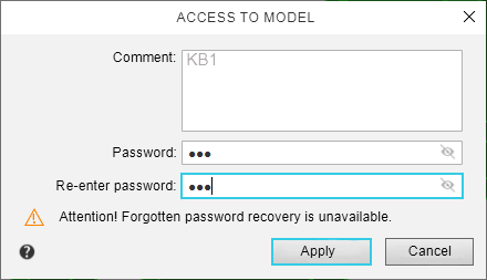 Allows you to set a password for access to the part model, change the password or delete it.