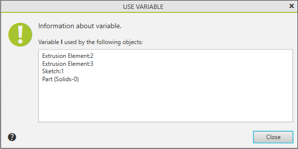 In dialog Use variable and Delete variable dialogs display a list of objects in the current document that use the variable selected for viewing or deleting.