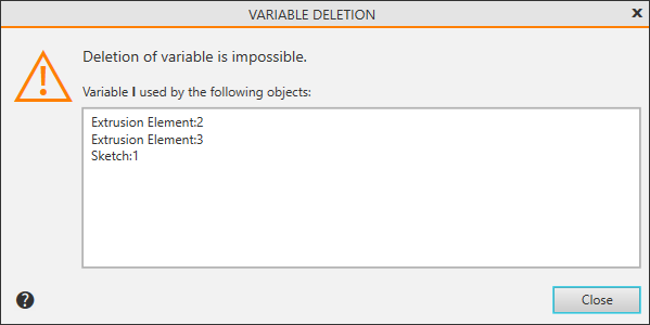•The dialog Delete variable appears on the screen when you try to delete a variable that is included in expressions for calculating other variables. More about variables deletion...