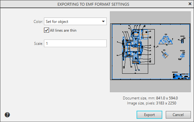 Since the size of the file in the EMF format is pre-estimated in points, a message may appear about the impossibility of writing a raster file. Details... For the export to be possible, the image must be zoomed out. |