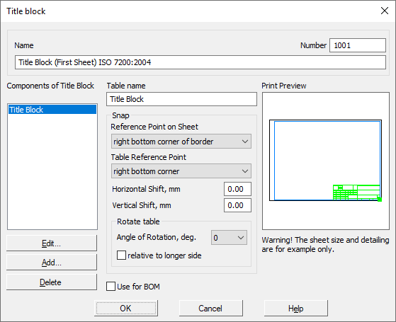 The option allows the use of a table selected in the Title Block Composition list for placing the text of the BOM items (the table must contain cells with the style For BOM Table, see section). Configure Extended Cell Format). This option can be enabled for only one table in the title block. If this setting is not enabled for any table in the title block, the system won’t be able to display the text of the BOM items, and an error message will appear. |