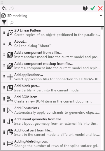The Command bar contains a list of KOMPAS-3D system commands. For each of the commands on the list a name, a brief description and an icon are shown (if there is no icon, the first two letters of the first two words of the command name are displayed instead).