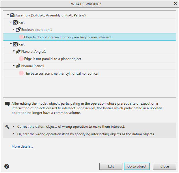This dialog lists the errors that occurred during the rebuilding of the selected object or the entire document (models or drawings). The dialog may also list parameters that the system warns about based on the results of variables values and mass check.