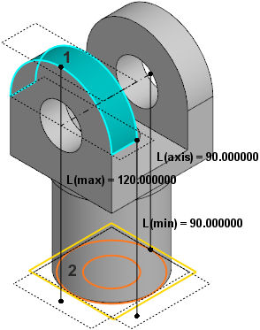 In the figure, an example of measuring distance between objects of the model in the specified direction is shown. The distance between faces 1 and 2 is measured in the direction defined by a plane coinciding with face 2; option Briefly disabled on the Parameters Panel, in table of measurement results Selected lines L(min), L(max), and L(axis).