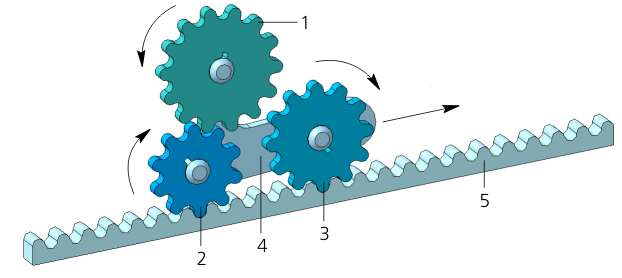 To view the work of a complex mechanism, if the task is not to show the movement of all its links, it suffices to specify the matings between the initial and final moving elements. In the example shown in the figure, this could be a mating Rotation – displacement, overlaid on wheel 1 and part 5. When part 5 moves, wheel 1 rotates, while wheels 2 and 3 do not rotate.