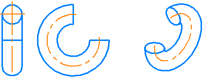 Centerlines: in the front view – a straight line, in the left-side view – a circular arc,