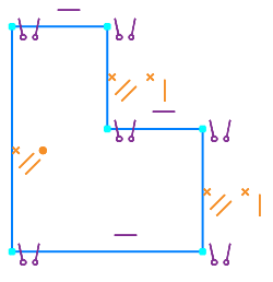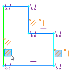 An ambiguous constraint (redundant or poorly conditioned) may be part of a group of several constraints of the same type (for constraint groups, see section). Viewing objects affected by constraint). In this case, the icon representing the group is also colored orange and marked with the symbol "x". The figures show the redundant constraint Parallelism, which belongs to the group of similar constraints applied to the leftmost vertical segment.