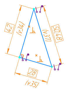 The figure shows an example of displaying locked dimensions placed in a sketch to the sides of a triangle. The block appeared after applying the constraint Perpendicularity to the sides of the triangle. To remove the lock, you should delete the constraint Perpendicularity. You can also delete one of the dimensions or make it informational.