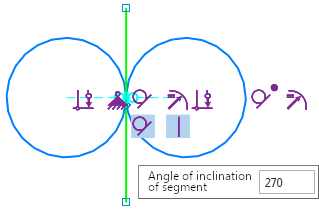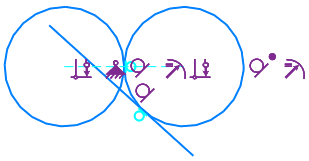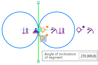 The figures show an example of a sketch constraint system with a poorly defined constraint. In the sketch, there are two circles and a segment that is connected to one of them with a Tangency constraint (Figure a). To position a segment vertically between circles, another constraint Tangency, is created, linking the segment and the second circle. This set of constraints does not ensure the vertical position of the segment (it is deviated by 0.00026°), so the created Tangent constraint is considered poorly defined and is highlighted in orange (Figure b). To make the line segment vertical, delete this constraint and apply the Verticality constraint to the segment (Fig. b). Now the segment is positioned in the required manner.