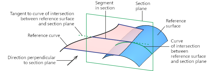 Linear surface on a curve with a tangent to the surface is achieved by moving a segment, with the start vertex of the segment lying on the selected curve and the end vertex on the selected surface, provided that the segment touches the surface at the given point (i.e., the segment in the section belongs to the tangent to the intersection curve of the surface with the section plane). The plane of the section in each of its positions is perpendicular to the specified straight-line direction or curve.