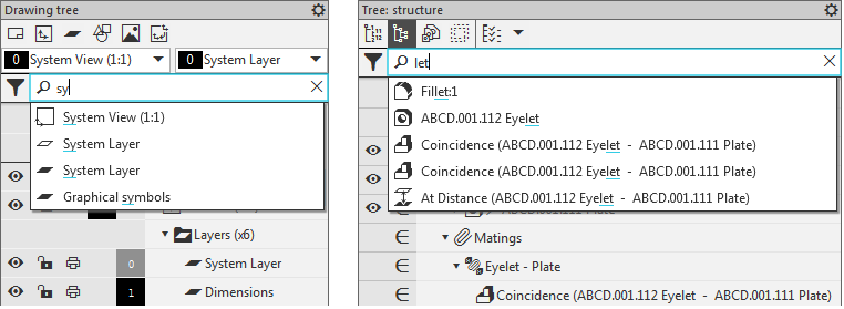 Search in the Drawing tree and in the Model tree
