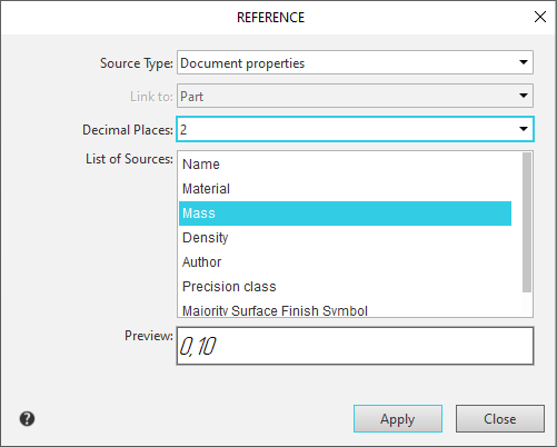 The list allows you to specify the number of decimal places displayed in the numeric value of the variable reference. The list appears in the dialog if the source of the link is Variable and replaces the option In parentheses. The list becomes available if: •for a variable, if Value or Name = value is selected in the Reference to list, •for a property, if a property specified by a number is selected in the Source List. Except for the Designation and Position properties. The variable value is rounded to the specified character. If 0 is selected, the link displays a rounded integer. The maximum number of characters is 6. A dash means that the property value in the link is displayed with the same number of decimal places as the property itself. Angular values in variable references are represented in decimal notation. |