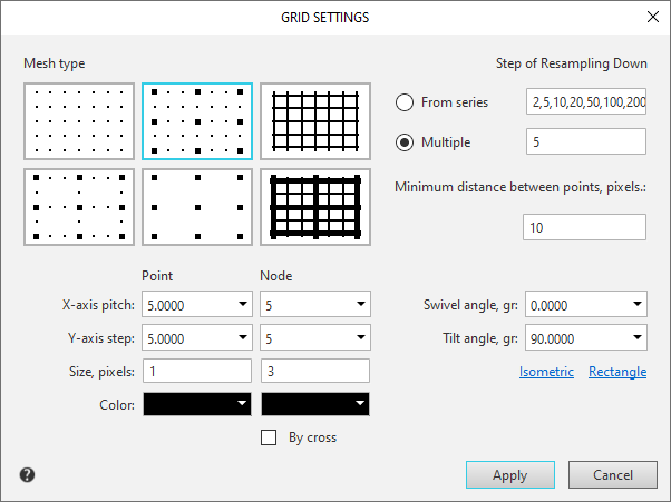 The field allows to set the minimum distance (in pixels) among grid points. With the reduction of image scale, the distance (in pixels) between grid points on the screen is reduced accordingly. As long as this distance is greater than the set minimum distance, the resampling of grid does not occur. On subsequent reduction of scale, the grid is resampled down according to the set parameters. |