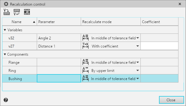 2.Specify the recalculation method for each variable and component. To do this, in the column cell Recalculation method from the drop-down list, select the required recalculation method: in the middle part of the tolerance field, by upper limit, by lower limit, with coefficient (for methods of recalculating sizes, see the table Recalculation methods of model sizes). When using the method with coefficient enter the coefficient value from 0 to 1 in the corresponding cell of the column Coefficient.