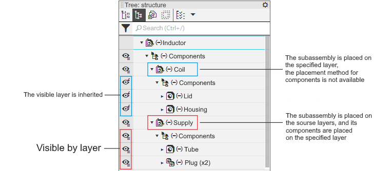 Inheritance of the visible/hidden state is available for model components of the second and subsequent levels, i.e. transfer of the visible/hidden value to the current model from the source model of the component. If the state of the component in the source model is changed, its state in the current model is automatically changed.The inherited state of the component is shown in the Design tree by the following icons: