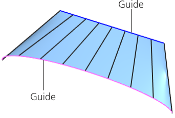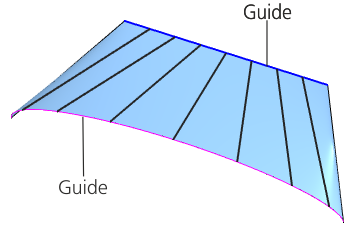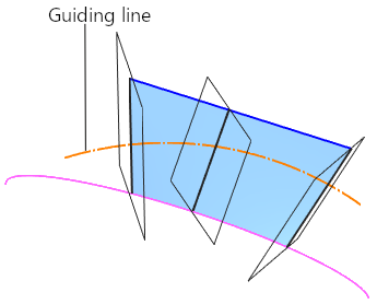 Along the length of the guiding curves When moving along the guiding curves, the segment at each intermediate position is oriented such that its starting and ending points have the same displacement along the guiding curves, expressed as a percentage of their length. |