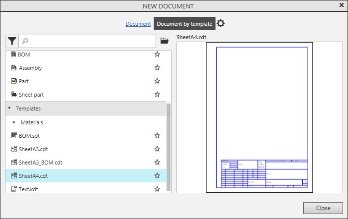 On the Start page or in the document creation dialog, click on the link Document by template. The list of document templates appears in the left part of the dialog box. Templates are grouped into sections. The first section – System – contains templates for new KOMPAS documents of each type.