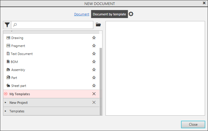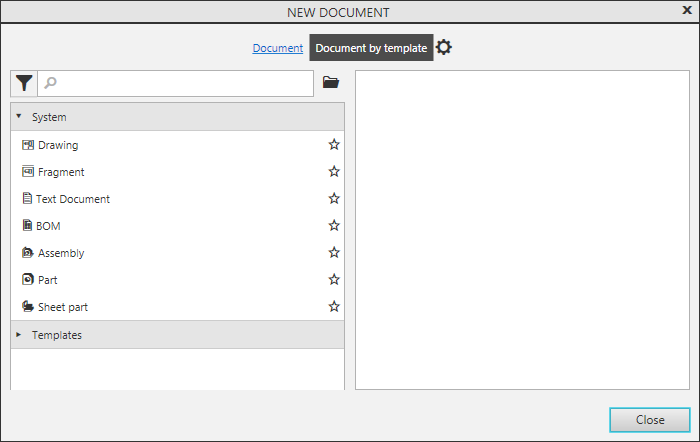 Document templates in the list are organized in sections. System section contains templates for new documents of all types (drawing, detail, etc.). When you select a template from this section, documents are created with exactly the same parameters as documents created using the icons on the Start page and in the New Document dialog, using commands from the starting menu activation button