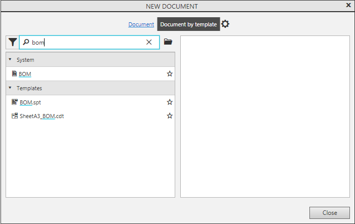 , and Create Drawing, and Create BOM by document commands. If in the Document templates dialog, the template for the selected type of documents is set, the document is created with settings according to the template. If a template is not set, the document is created with default settings.