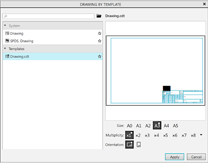 To change the format, multiplicity and orientation of a sheet, press the required button in the corresponding group. When changing the parameters of a sheet, the template itself does not change, and the document image in the right part of the dialog remains unchanged. The specified parameters will be applied only to the newly created drawing.