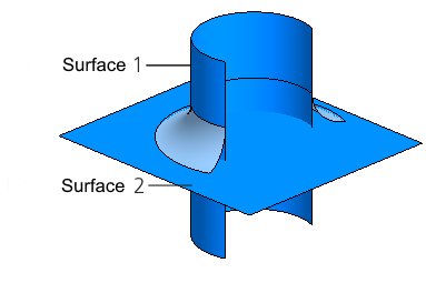 In the switch position Tangent plane the original surface is trimmed along the intersection curve with the plane formed by the tangent vector to the fillet surface boundary at its final vertex and the normal vector to this surface at the same vertex. For example, the figure below shows the fillet between surfaces 1 and 2. Surface 1 is trimmed along the fillet surface boundary, and surface 2 requires additional trimming.