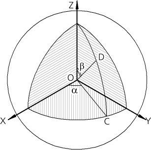 The direction of the vector is determined by two angles A and B. Angle A corresponds to the azimuth angle α spherical coordinate system, and the angle C – the zenith angle β. The origin of the spherical coordinate system coincides with the origin of the coordinate system of the vector. Azimuth angle α is counted in the XY plane of the vector coordinate system from the X axis counterclockwise (see figure below). In the XY plane, the OC beam is conducted at an azimuthal angle to the X axis.