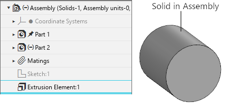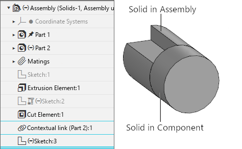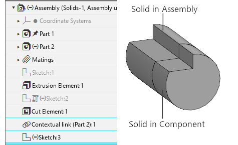Part 2 with the extrusion operation, a new solid was created. Its source object is a face of a solid built in the assembly, therefore, in the Assembly Design Tree, an object