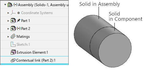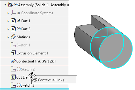 Contextual Link (Part 2):1 (Figure 2) appeared. When further working with the assembly, the solid built in it has changed — a cut was made in it. Cut operation