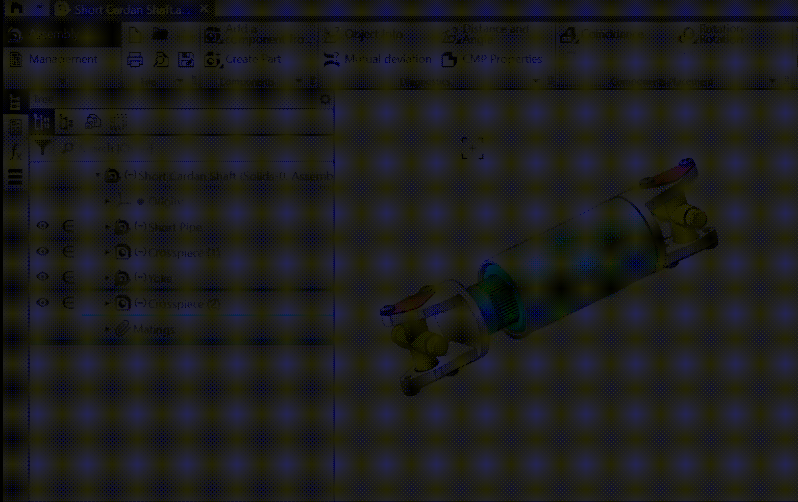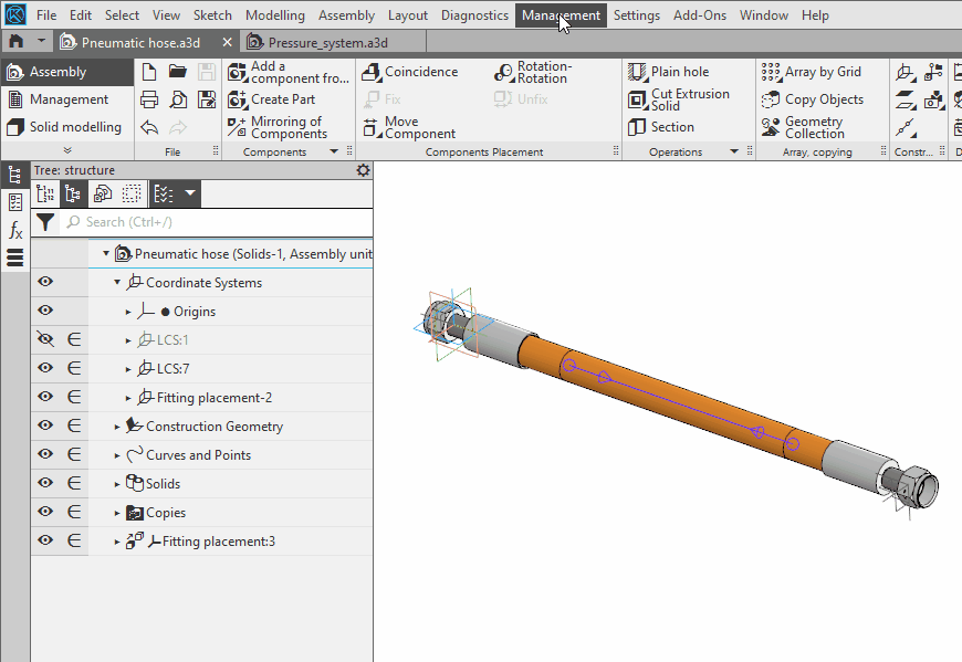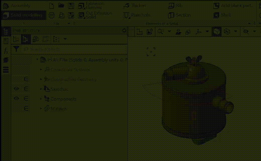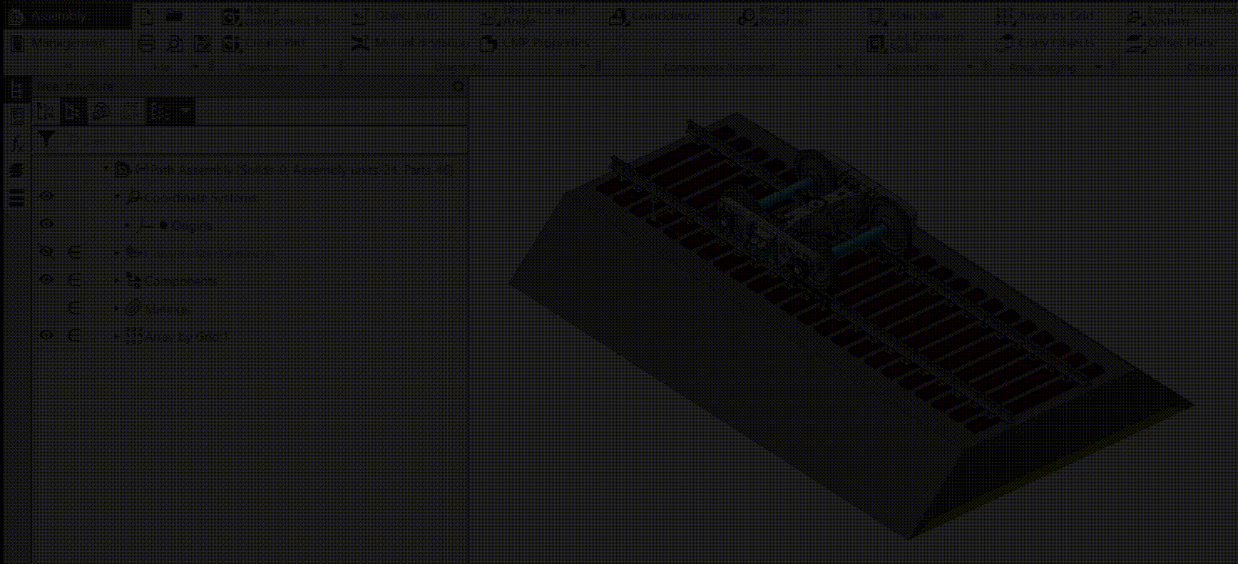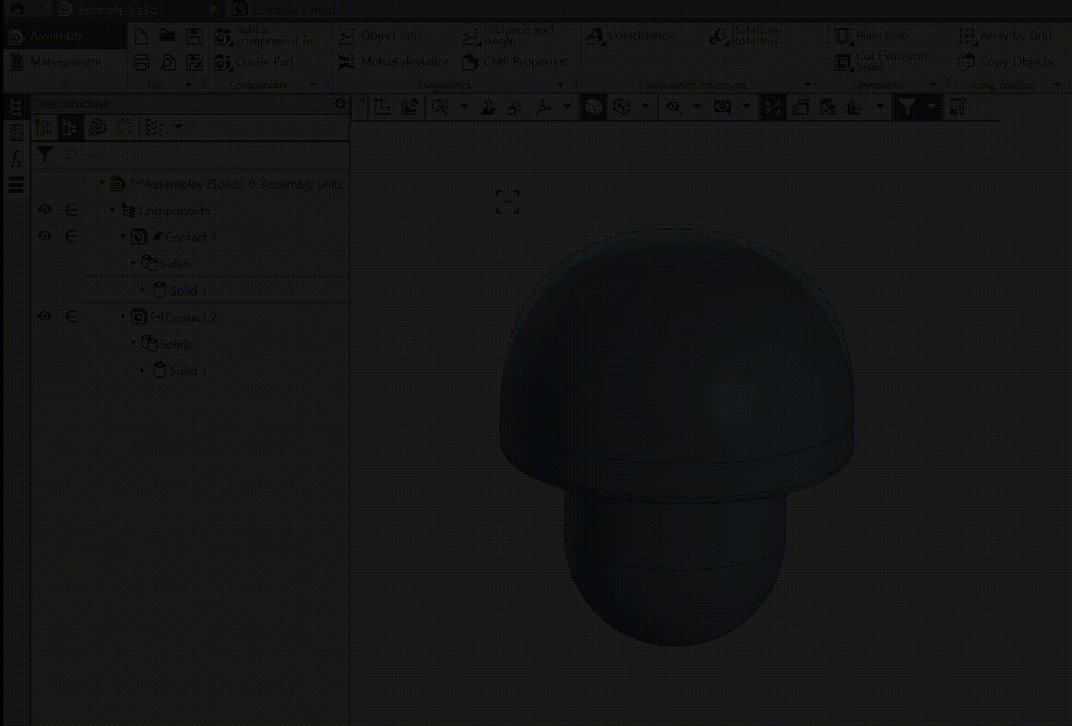 18.The ability to copy components via the clipboard and paste them into the same or another model has been implemented, including during context editing. Any component at any nesting level can be selected for copying; pasting is done at the first level. If necessary, during copying it is available to enable saving the matings between the copied components and between them and the coordinate system of the model containing them.