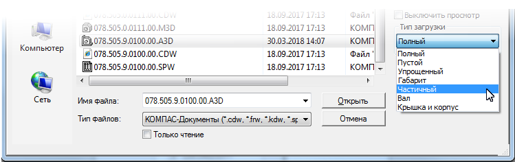 Выбор типа загрузки выполняется в диалоге открытия файлов в списке Тип загрузки (список появляется при указании в диалоге файла сборочной модели).