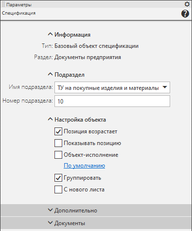 Если в таблице спецификации выделен какой-либо объект, его параметры отображаются на Панели параметров (см. рисунок).